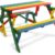 Dieser Kinder-Picknicktisch kann leicht umgebaut werden und so zur Picknickbank umfunktioniert werden. Sie ist vor allem für Kinder geeignet, auf der Sitzbank finden jedoch auch Erwachsene leicht Platz. Das gesamte Holz ist in grün, rot, blau und gelb lasiert. Der Artikel ist ideal für die Terrasse oder den Garten geeignet, aber auch für drinnen!